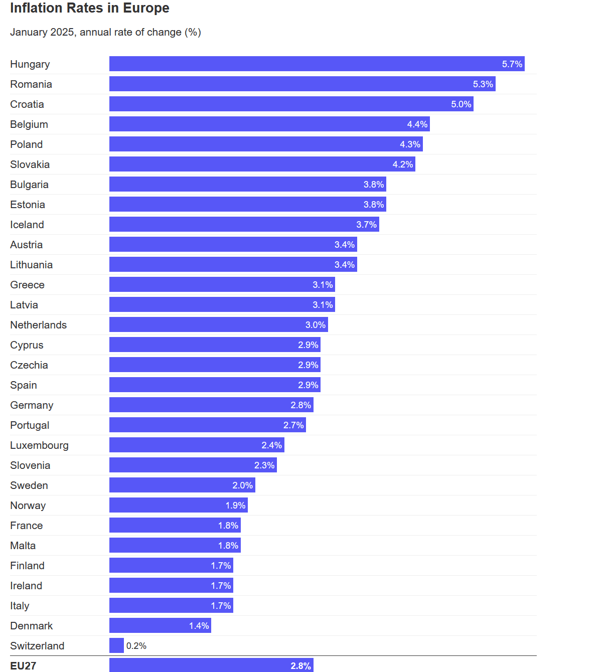 Хърватия също се посочва като пример защо България не трябва да приема еврото. Приела еврото през 2023 г. Хърватия е с най-висока инфлация в еврозоната към януари 2025 г. – 5,0%.